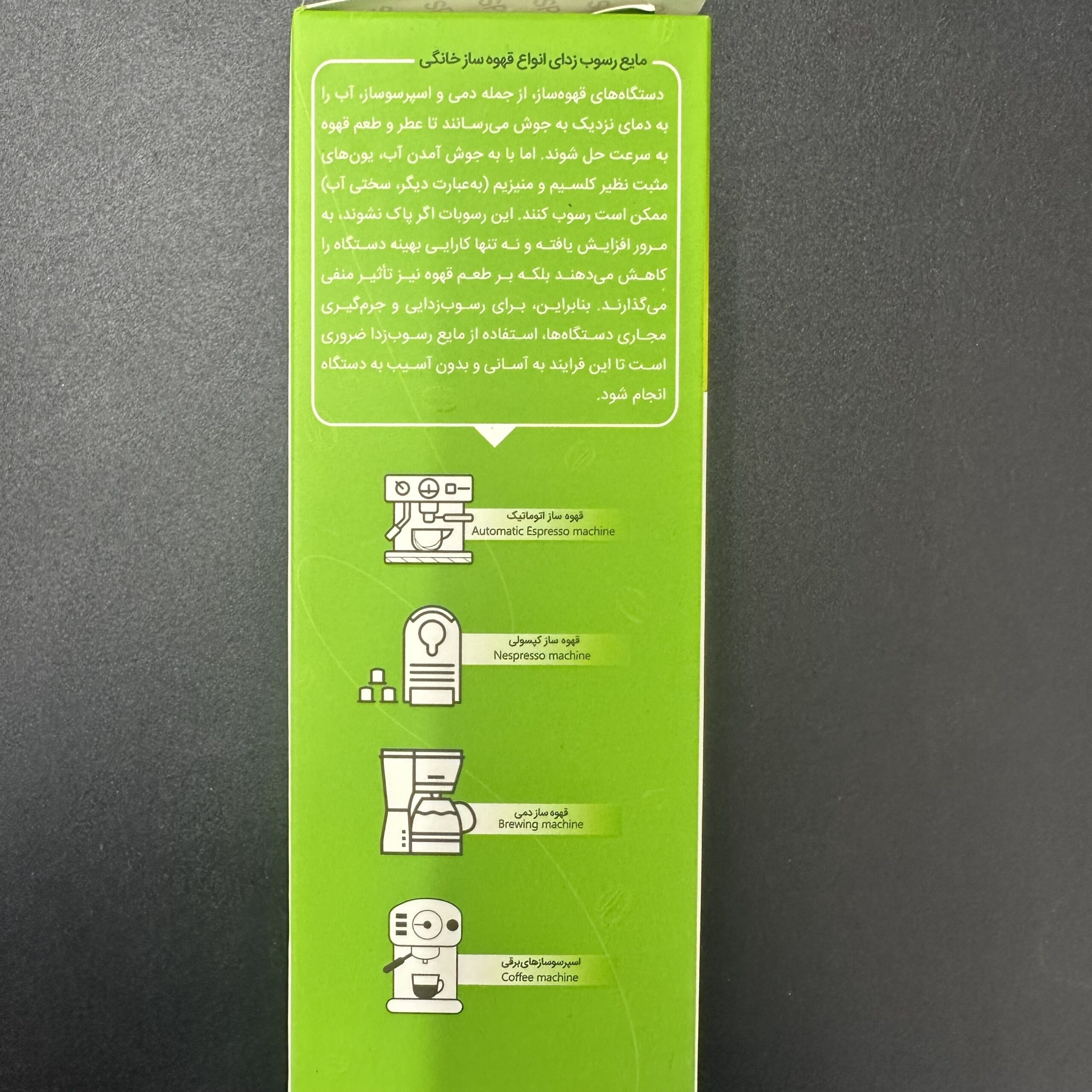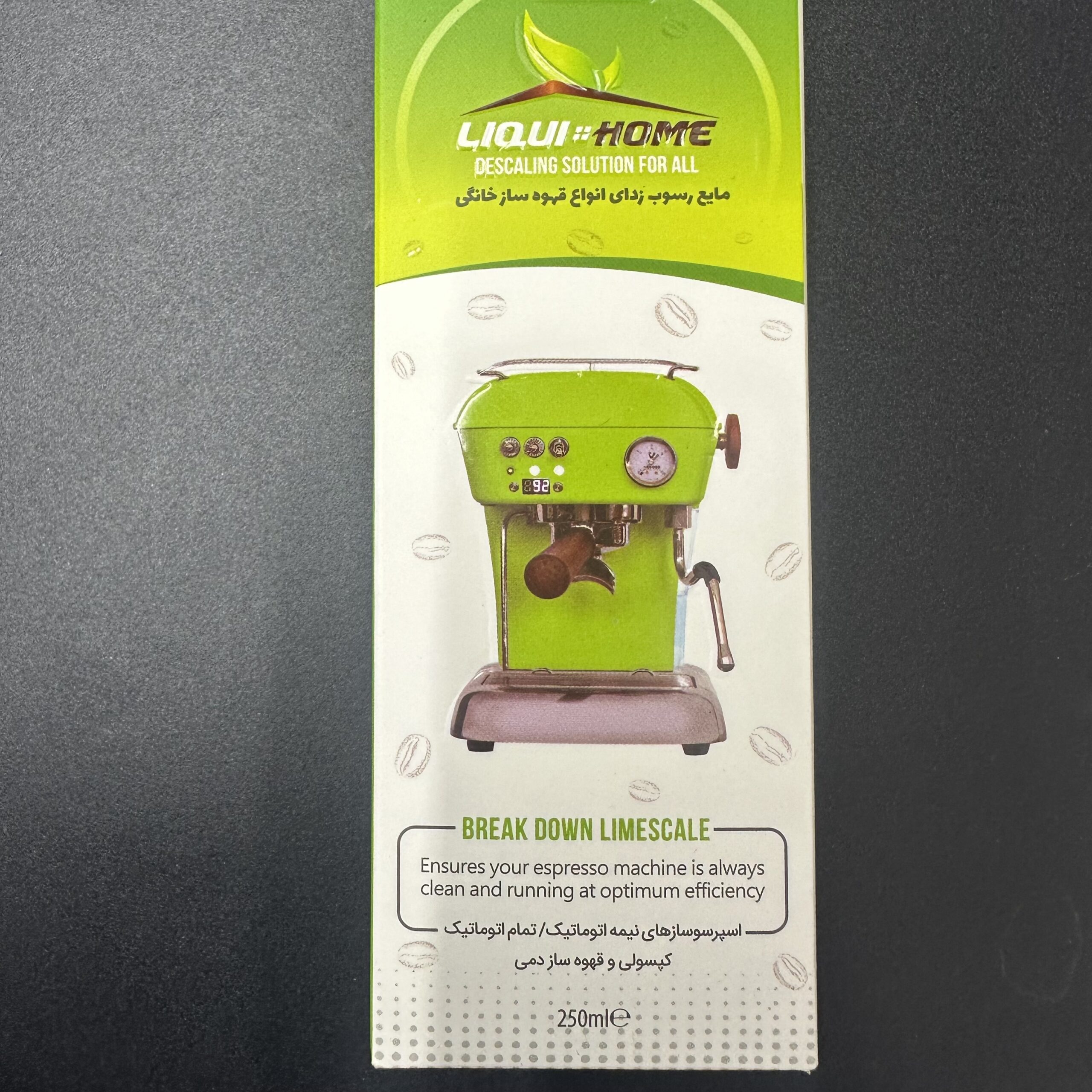 مایع رسوب زدای خانگی قوی و هر بطری برای سه بار استفاده میشود و به طور ویژه برای شستوشو، جرمگیری و از بین بردن چربیهای ناشی از شیر در دستگاههای اسپرسوساز خانگی طراحی شده است. این محصول با فرمولاسیون پیشرفته اسیدهای ارگانیک، نهتنها قدرت پاککنندگی بسیار بالایی دارد، بلکه کاملاً سازگار با محیطزیست بوده و بدون بو و طعم است، بهطوری که هیچ اثری روی مزه قهوه باقی نمیگذارد.
